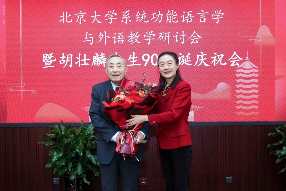 申丹教授向胡壮麟先生献花祝贺其90华诞